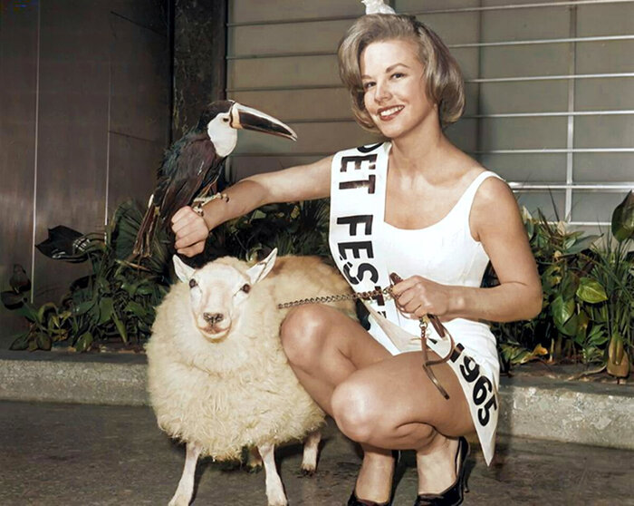 21-летняя Санни Остин выиграла конкурс и позирует с барашком и туканом.
