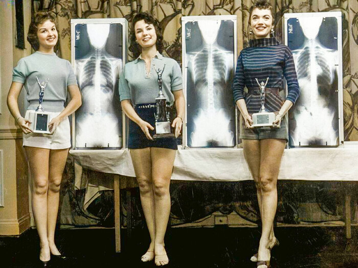 В этом конкурсе судили по внутренней красоте, а точнее по самой равной осанке. Каждая из девушек стоит рядом со своим рентгеновским снимком.