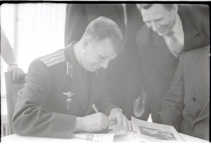 Летчик-космонавт СССР, Герой Советского Союза Алексей Леонов отвечает на вопросы журналистов на пресс-конференции, посвященной полету космического корабля «Восход-2» и выходу Алексея Леонова в открытый космос, 25 марта 1965 года