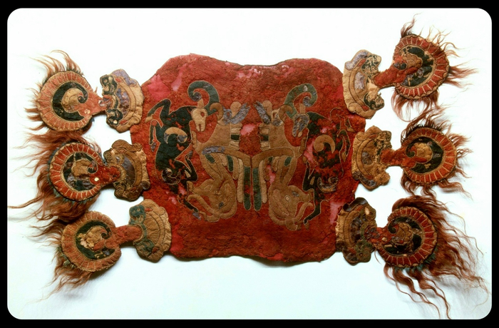 Он был обнаружен в Пазырыкских курганах на Алтае в Сибири, где пролежал в вечной мерзлоте более 2000 лет.