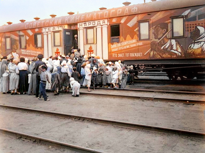 Советский кинематограф на Украине в 1919 году - публика у киновагона агитпоезда имени Ленина.
