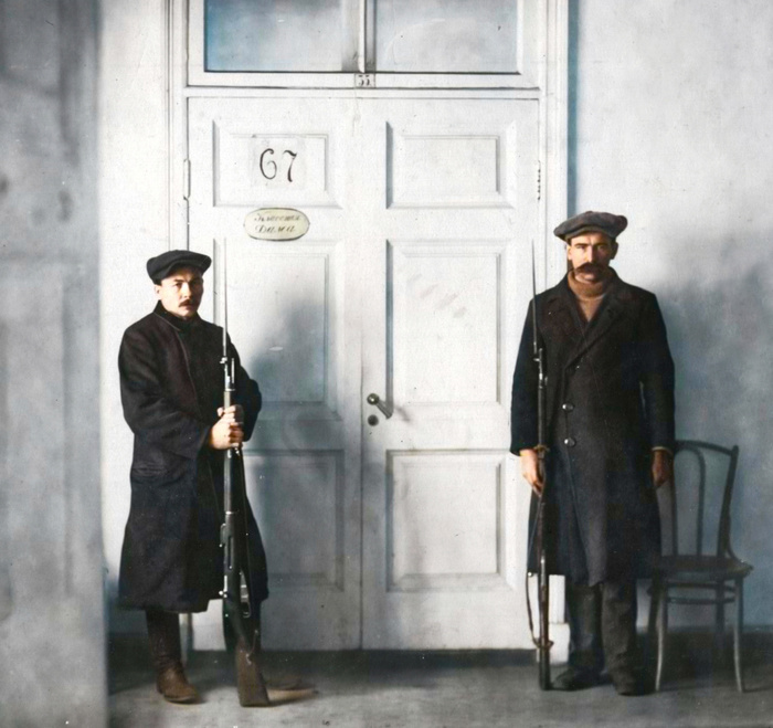 Большевики на посту у кабинета Ленина в Смольном. На двери кабинета — надпись «Классная дама»: до революции в здании располагался Институт благородных девиц. Петроград. Ноябрь 1917 года.