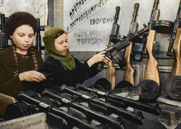 Пятнадцатилетние девушки Нина Николаева и Валя Волкова собирают пистолеты-пулеметы ППД в блокадном Ленинграде, 1942 год.