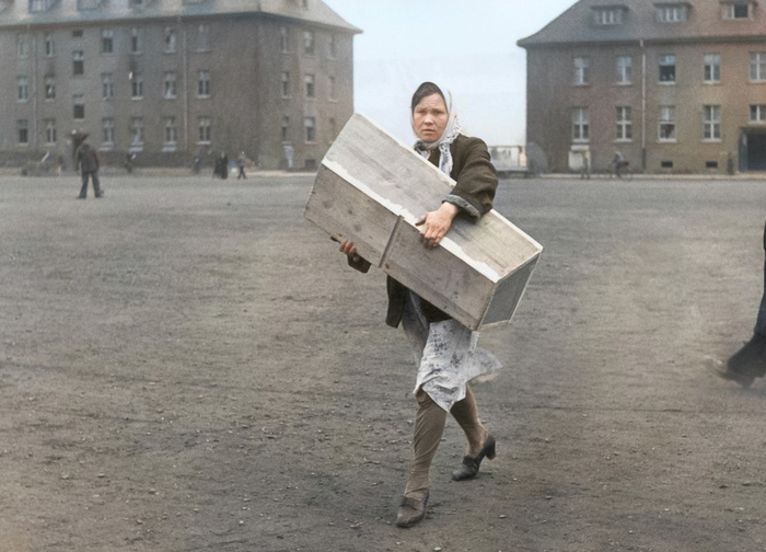 Русская женщина несет небольшой гроб с телом своего мертвого ребенка через двор Центра для перемещенных лиц 2-й армии, где раньше располагались немецкие артиллерийские казармы Винкельхаус в Оснабрюке, Германия.