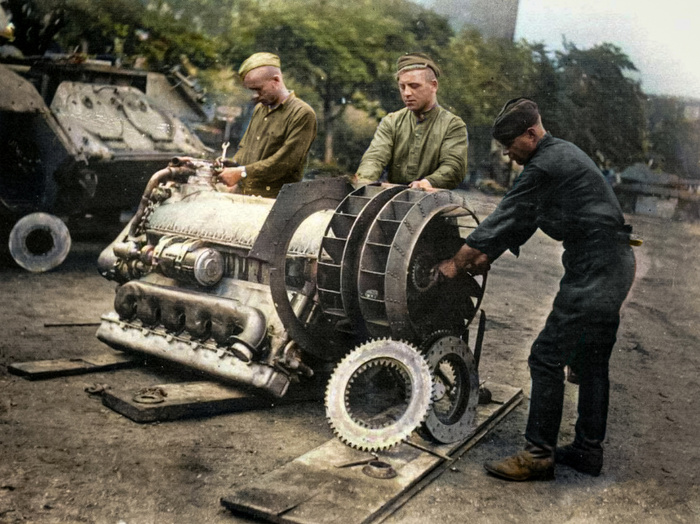Советские механики за ремонтом двигателя тяжелого танка ИС-2, 1944 год.