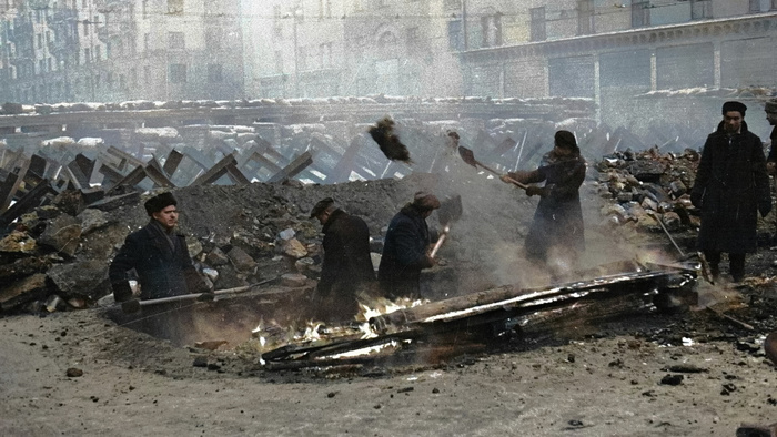 Осенью 1941 года жители Москвы активно участвовали в сооружении баррикад на городских улицах, готовясь отстоять столицу от надвигающейся опасности немецкого наступления. В условиях приближающейся угрозы обычные люди — рабочие, студенты, женщины и старики — взялись за лопаты, кирпичи и деревянные брусья, превращая городские кварталы в систему оборонительных укреплений.