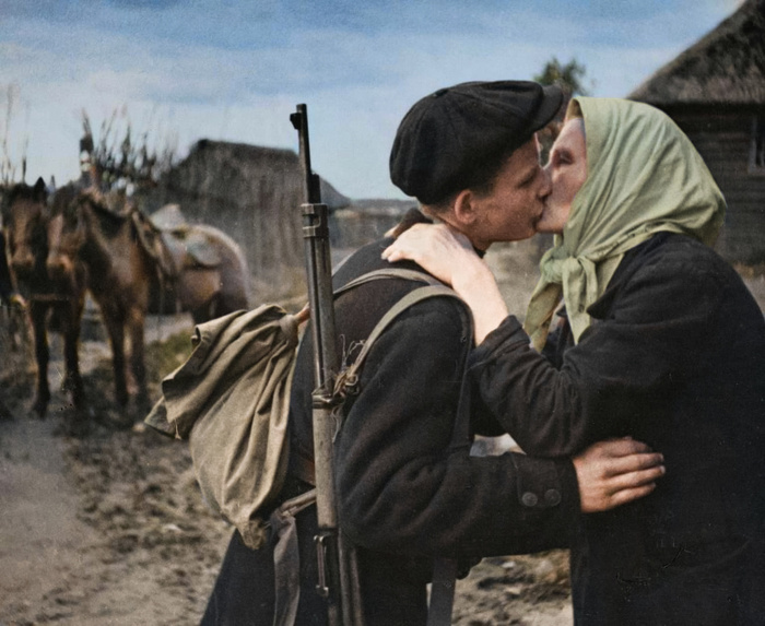 Сын целует мать на прощание, уходя в партизанский отряд, чтобы сражаться за освобождение своей земли от нацистских захватчиков, 1942 год.
