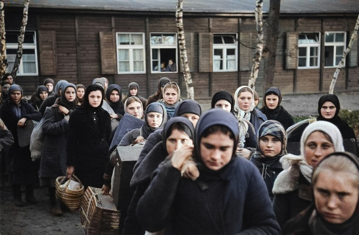 Девушки, привезенные из СССР на принудительные работы в Германию, прибыли в транзитный лагерь Berlin-Wilhelmshagen, 1942 год.