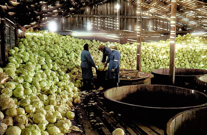 Совхоз "Люберецкие поля орошения". Идёт закваска капусты для отправки на фронт, Московская область, 1944 год.