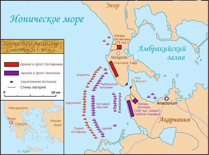 Основная кампания должна была развернуться в 31 году до н.э. Антоний растянул свои силы вдоль побережья Греции, чтобы можно было оперативно обнаружить высадку противника и блокировать его. Однако расчет на господство в море оказался преждевременным. В самом начале года Агриппа серией молниеносных ударов флота разбил несколько эскадр Антония и занял удобные гавани. Благодаря чему Октавиан смог беспрепятственно высадить войска и занять выгодные позиции недалеко от мыса Акций.