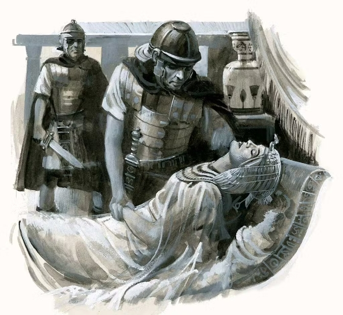 Клеопатра действительно могла так поступить — Антоний всё равно был не жилец, а вот она ещё могла надеяться договориться с Октавианом. Но если такие надежды и были, то они оказались тщетными. Октавиан решил, что после военной победы над Египтом царица уже ему не нужна, а потому собрался провести её в триумфе. После этих новостей последняя из династии Лагидов покончила с собой.