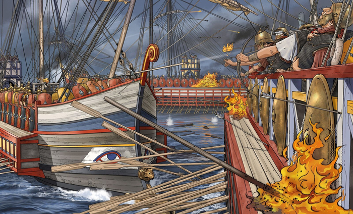 В начале сражения, состоявшегося 2 сентября 31 года до н.э., оба флота сошлись в битве, где сражались на равных.