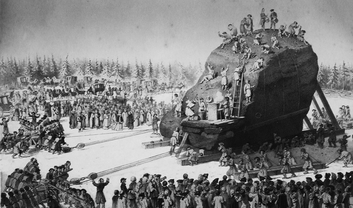 Под него подложили деревянные сани, а под сани — медные шары, которые катились по специальным желобам. Сотни людей с помощью лебёдок и канатов катили камень к Финскому заливу. Это заняло четыре месяца! А потом камень-исполин погрузили на баржу и доставили в Петербург.