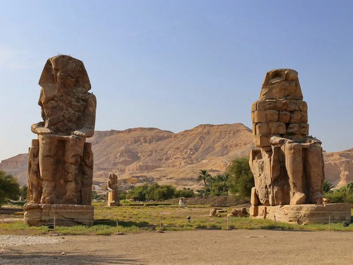 Колоссы Мемнона — это два гигантских каменных стража, которые стоят в Фиванском некрополе, на западном берегу Нила, неподалёку от современного Луксора в Египте. Вес каждой статуи оцениваются в 720 тонн.