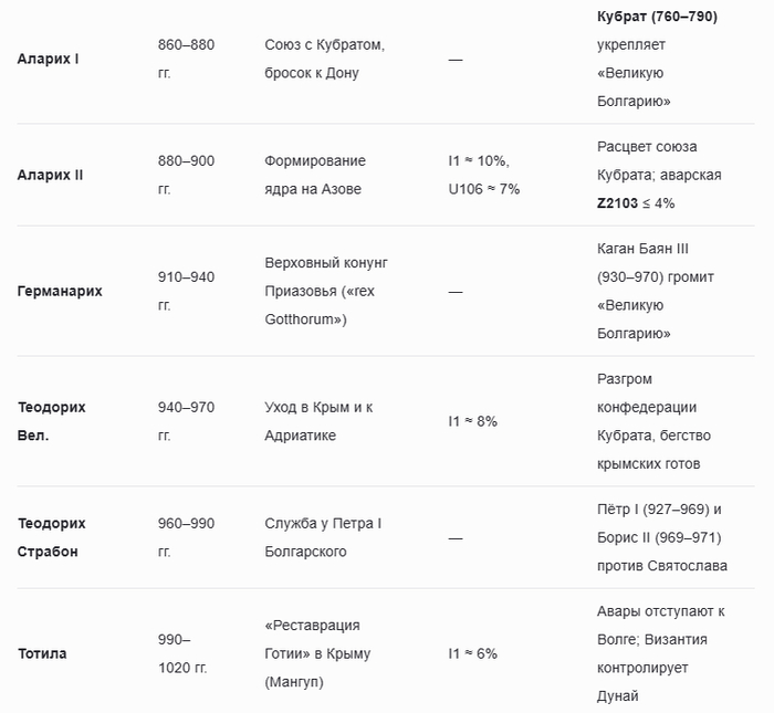 За каждым именем здесь — двойник. Бериг, ведущий дружину с I1-Z63 к Висле, — это отражение аварских лазутчиков на Волге. Атанарих, воюющий у днепровских порогов в 860-м, — зеркало союзов, из которых родится Великая Болгария. А «реставрация Готии» в Крыму 990 года — последний вздох народа, чья кровь (I1 ≈ 6%) уже растворяется в генетическом котле алеманов-аланов.