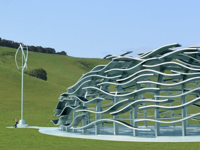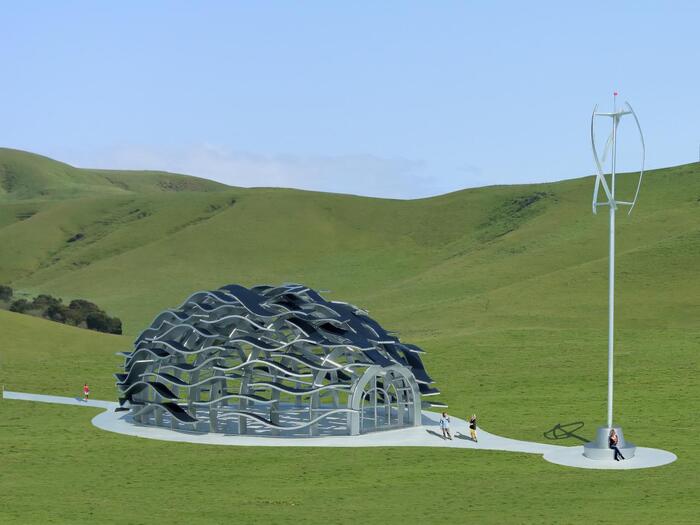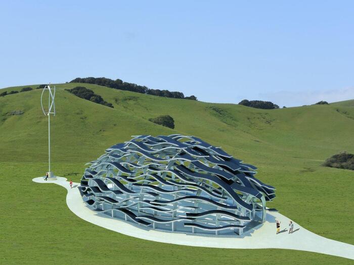 Представьте: вы приходите на дегустацию вина, садитесь под навесом, похожим на волны холмов, а над вами мягко вращаются солнечные панели и тихо шелестит ветряк. Так выглядит дегустационный павильон Solar Winds — здание, которое объединяет архитектуру, природу и энергию.