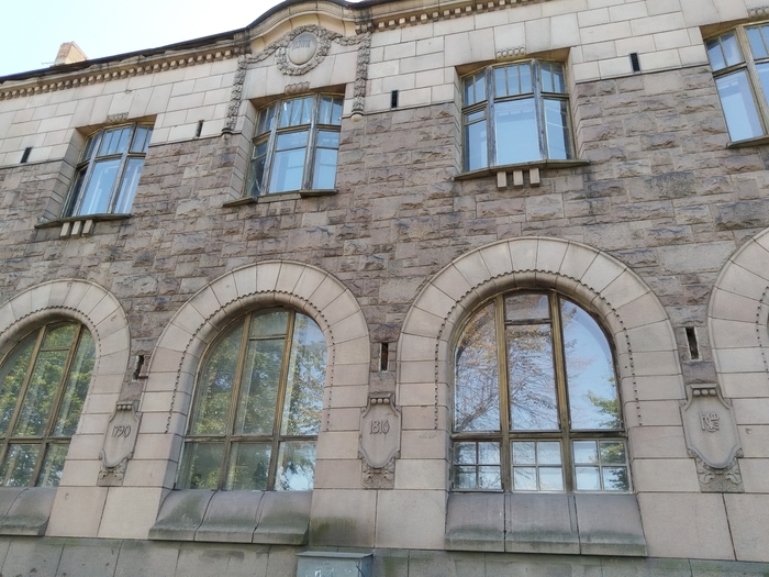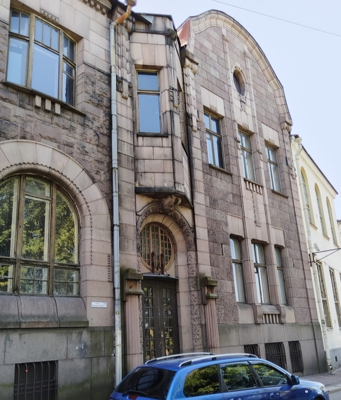 Над главным входом — медальон с названием банка на финском и шведском (Pohjoismaiden Osakepankki Kauppaa ja Teollisuutta varten, Nordens Aktiebank).