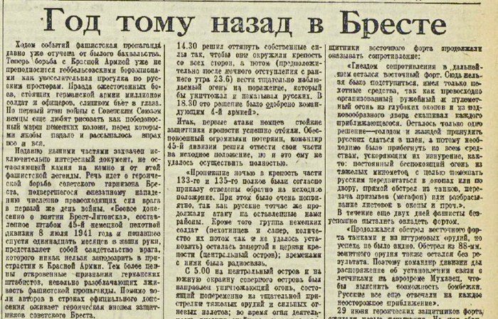 - Отлично помню. Накануне, 21 июня, мы проводили тактические занятия за пределами крепости, практически на границе - даже слышали команды, отдаваемые немцами. К вечеру, возвращаясь в крепость, встретили машину комдива генерала Ивана Лазаренко - он ехал в Минск. Вечер был свободным: кто смотрел кино, кто стирал воротнички, кто писал письмо домой. Всё вроде как обычно, но командиров не видно и сигнала отбоя нет. А накануне в крепости появилась старуха-нищенка, подбиравшая объедки. Откуда она здесь? Задержали, сняли с неё верхнюю одежду - оказалось, это загримированный немецкий солдат.