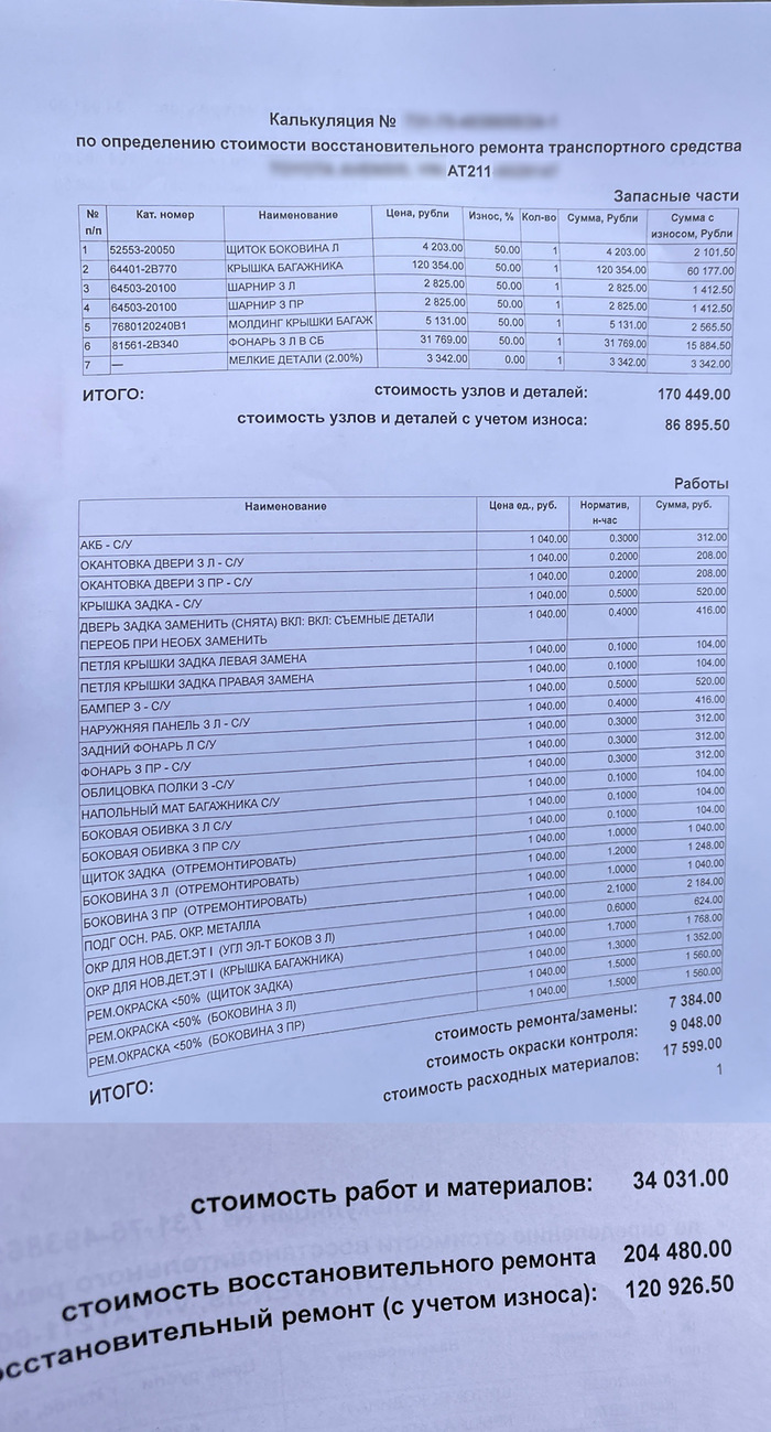 Точный порядок дальнейших событий припомнить сложно, но, кажется, мне позвонили из страховой с просьбой приехать с реквизитами карты для получения выплаты. Приехав, запросил калькуляцию (см. фото ниже).