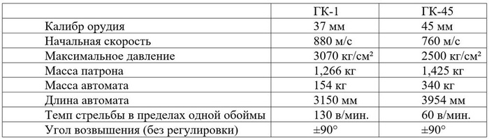 Таблица 4. Основные характеристики пушек ГК-1 и ГК-45