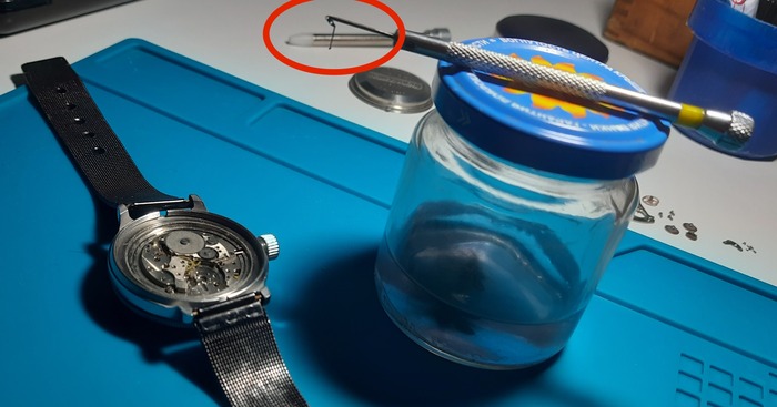Долго искать причину не пришлось, часы сильно намагничены, об этом свидетельствует прилипшая к отвертке пружинка секундной стрелки, или как называют часовщики "клюшка" потому что имеет форму клюшки.