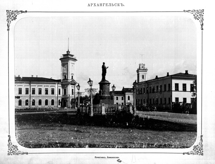 Первая мысль соорудить памятник Ломоносову принадлежит Епископу Неофиту. С Высочайшего соизволения Государя Императора Александра Павловича, в 1825 году открыта была подписка, в которой вся Россия принимала живое участие. Ректор Академии художеств, Действительный Статский Советник И. П. Мартос начертал проект памятника М. В. Ломоносову, который и был утвержден. Идею для составления памятника художник подчерпнул из оды Ломоносова «Вечернее размышление о Божием величии при виде великого Северного Сияния». В Мае 1829 года памятник был совершенно готов. Отлит он был из бронзы и стоимость его 53.302 рубля 89 копеек. 25 июля 1832 года памятник торжественно был открыт.