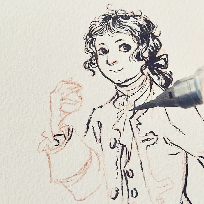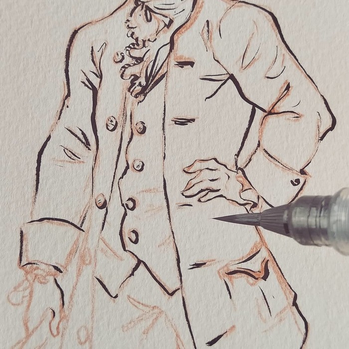 После перенесения рисунка на чистовую бумагу я делаю аккуратный лайн брашпеном с водостойкими чернилами.