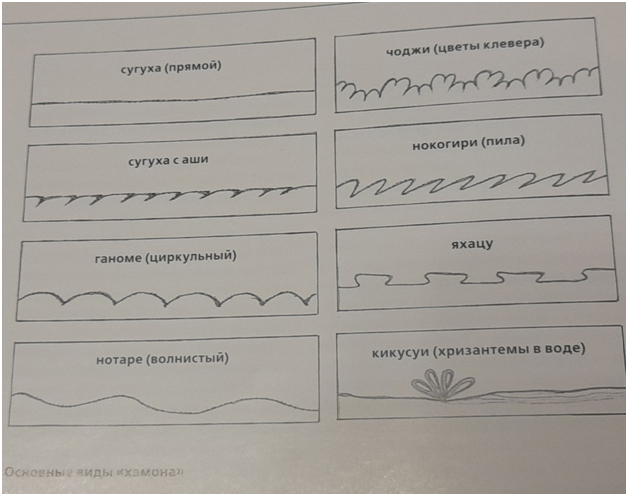 «Линия хамон может быть образована более-менее узкой, резкой или несколько размытой, иногда прерывистой линией молочно-белого цвета, называемой «ниоми» - узкой переходной областью…»