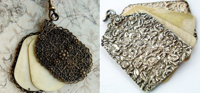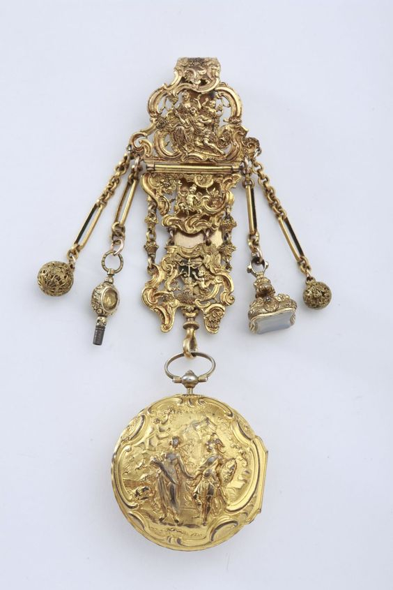 Этот крайне рациональный аксессуар был популярен еще со средневековья и вплоть до XX века. Он представлял собой специальный зажим, к которому на цепочках крепились разнообразные полезные мелочи: кошелек, ключи, часы, карандашик, наперсток и т.п. Носилась такая конструкция на поясе.