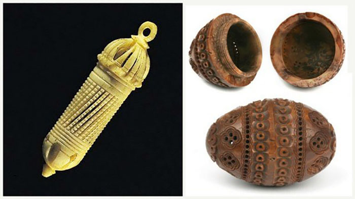 Этот футляр для живых цветов был в моде в XVIII-XIX веках. С его помощью небольшой букет можно было нести в руках, не пачкая наряд, или приколоть к себе. С помощью раздвижных ножек-подставочек аксессуар быстро превращался в миниатюрную вазочку.