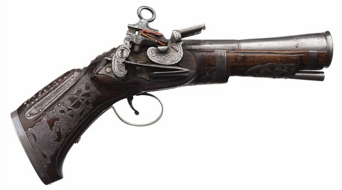 На фото - мушкетон-пистолет. Ствол специально был сделан дудкой. Пользовался популярностью среди пиратов, всадников и диванных стрелков. Большая площадь поражения на коротких дистанциях не давала шансов промахнуться. Также в раструб проще было насыпать порох дрожащей с похмелья рукой и насыпать ирисок заряд свинцовых шариков. Ношение и использование не требовало специального разрешения. Самое то, чтобы шмалять в воздух в разгар южной свадьбы в кортеже из гасконцев или корсиканцев.