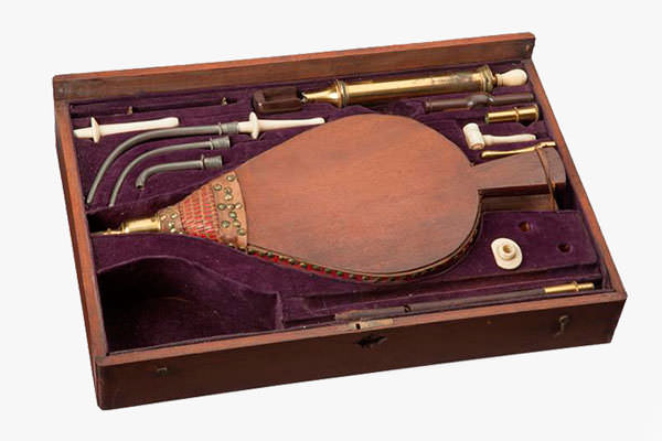 На самом деле это табачная клизма. С ее помощью табачный дым вдувался в прямую кишку пациента для различных медицинских целей, в первую очередь для реанимации жертв утопления.