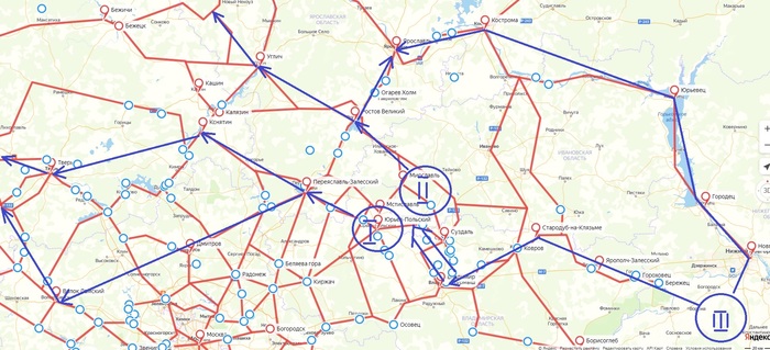 - третий отправился на восток через Стародуб-на-Клязьме по лесам в сторону Городца Радилова (Городец, Городец-на-Волге) и далее пошёл по Волге наверх - Кострома-Ярославль.