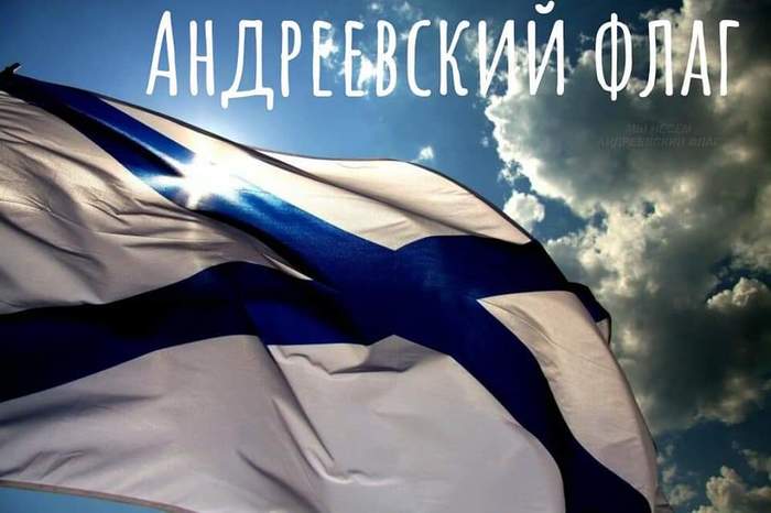 Это флаг с косым «Андреевским» крестом. Использовался как кормовой флаг кораблей Военно-Морского Флота Российской империи в 1865-1917 годах, в 1944-1946 годах являлся официальным флагом Комитета освобождения народов России, с 1992 года - военно-морской флаг Российской Федерации, с 1 января 2001 года — знамя Военно-Морского Флота Российской Федерации.