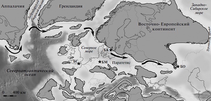 Карта эры Мезозоя наложенная на современную карту Европы. Где видно где находилась тогда суша.