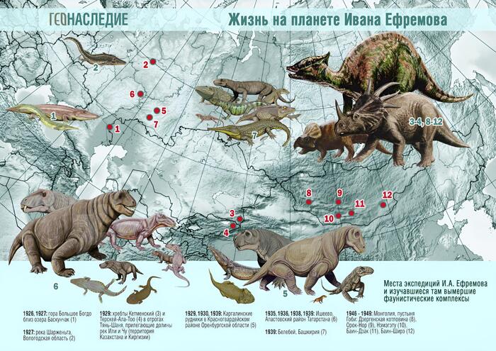 На карте отмечены годы и места палеонтологических экспедиций Ивана Антоновича Ефремова и изучавшиеся там ископаемые фауны пермских, триасовых и меловых ящеров. Зеленые цифры обозначают фаунистические комплексы и соответствуют местам раскопок, отмеченным красными цифрами.