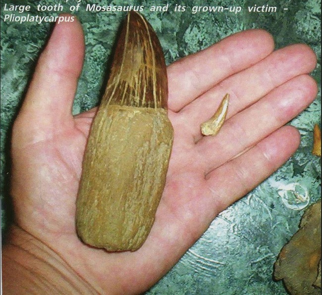 на фото Зуб огромного мозазавра из Волгоградской области (слева) и его жертвы — другого мозазавра плиоплатекарпуса. Фото © А. Ярков из статьи Ярков А., 2007. Мозазавры в степях Волгограда