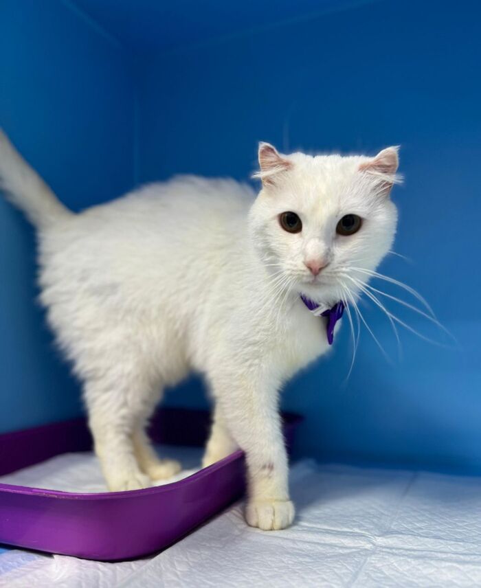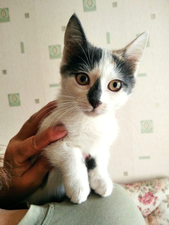 Маленькой кошечке нет еще и двух месяцев. Она родилась от домашней кошки, а потом хозяева выставили кошку на улицу вместе с тремя новорожденными котятами.