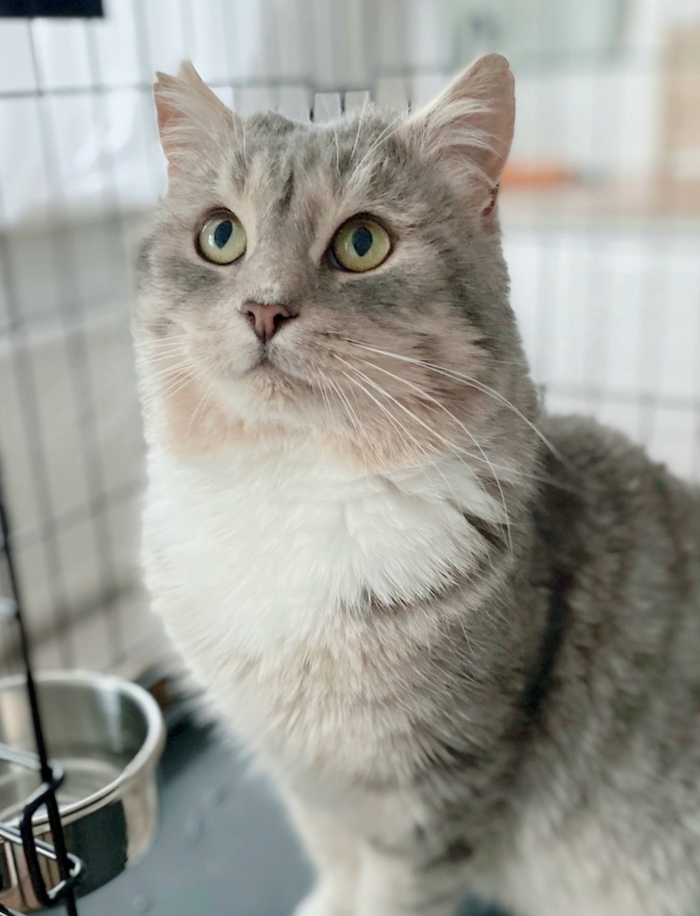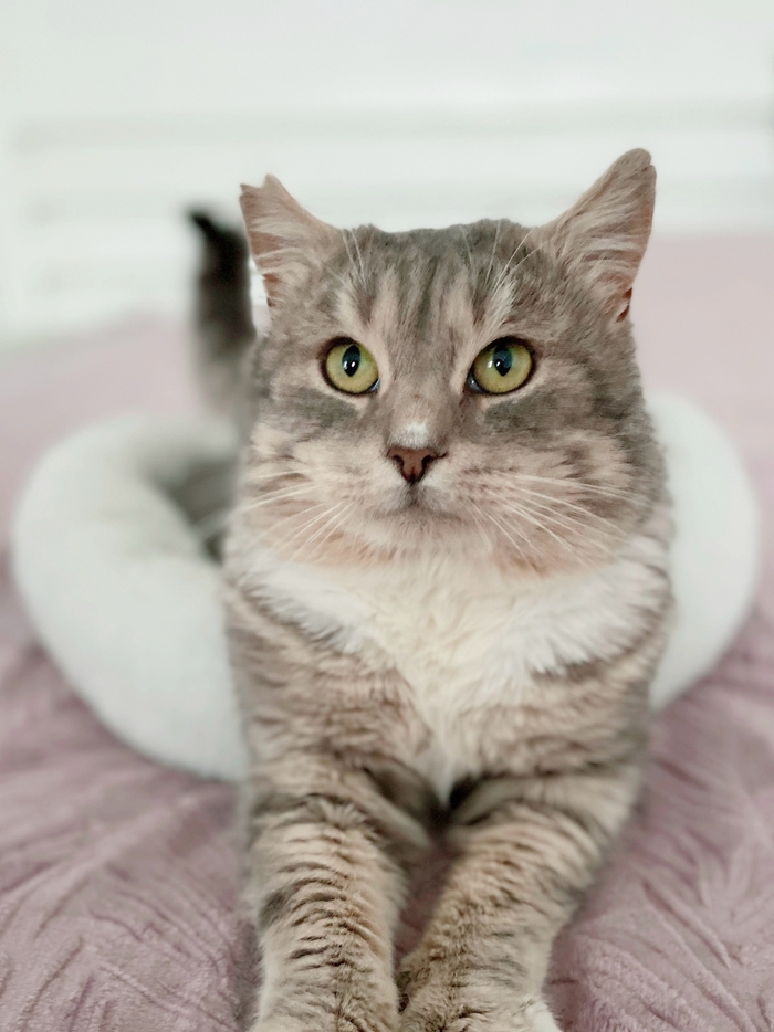 Сейчас это котик красавец, шерсть шелковистая с проседью, характер развесёлый- играть, скакать, хулиганить, это наше всё). Отлично ладит со всеми кошачьими, собак не боится. Ласковый и абсолютно ручной парень.