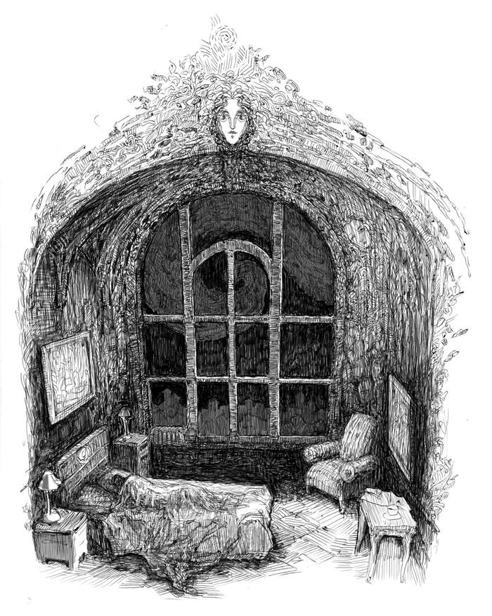 На подоконнике рядом с засохшим кактусом, похожим на магическую куклу для заклинаний, стояла табличка с надписью: “В Проклятое Поле не смотреть. Сойдёшь с ума и сгинешь”. В уголке, в назидание, был нарисован человечек в смирительной рубашке. Художник умело передал его психические повреждения.