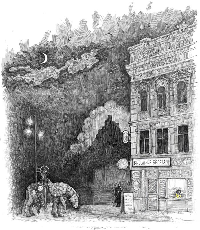 “Жёлтое платье видишь?” —сказал дворник и показал на витрину “Кисельных Берегов”. За дальним столиком сидела Маргарита в платье своего любимого цвета. Левша усмехнулся. Он узнал бы её и с луны, и нечего пальцем тыкать. Спрыгнув с кадавра в сырой снег, он сбил на затылок шлем, посмотрел на Детское море, исчезающее в темноте мартовской ночи, на редкие, сонные огни родной Герники, на вывеску кафе, уютно мигающую неоновыми буквами сквозь мягкий снежный штрих. Ну вот и всё… оставалось войти. Несколько шагов и… Родной ставрийский ветерок вдруг свистнул в голых ветках и юркнул за пазуху.