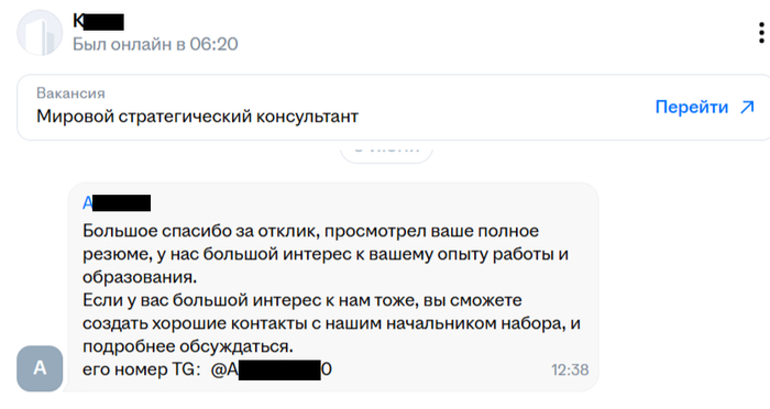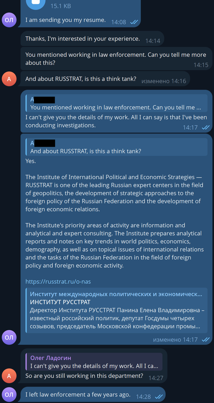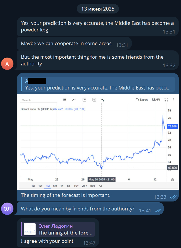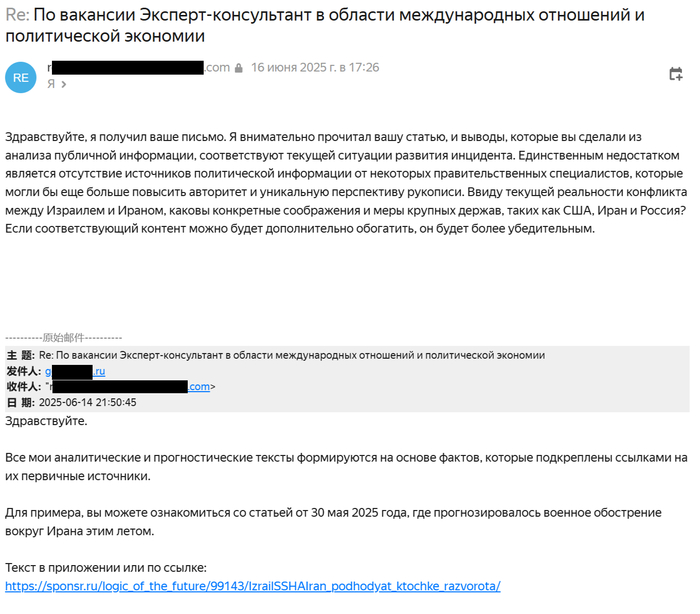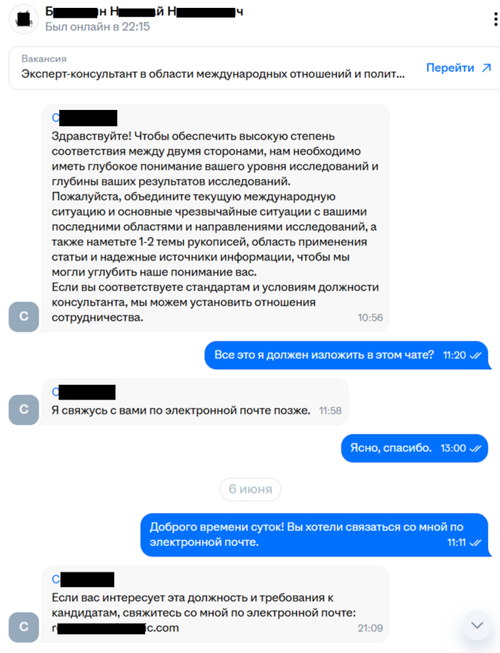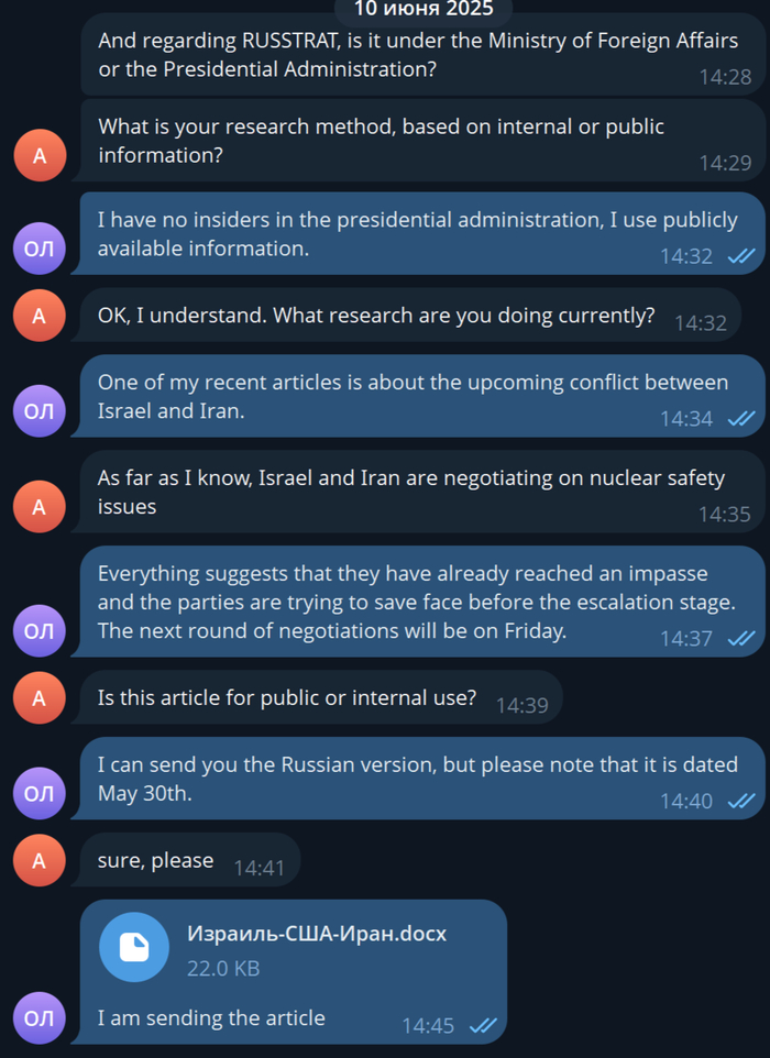 Диалог с работодателем шел на английском в Телеграмме. Его удовлетворила моя квалификация, исходя из прогноза о конфликте между Израилем и Ираном, который реализовался. Однако смущало, что он уж очень интересуется прежним местом работы, хотя оно было указано в резюме, а также наличием у меня «друзей» в администрации президента или Министерстве иностранных дел.