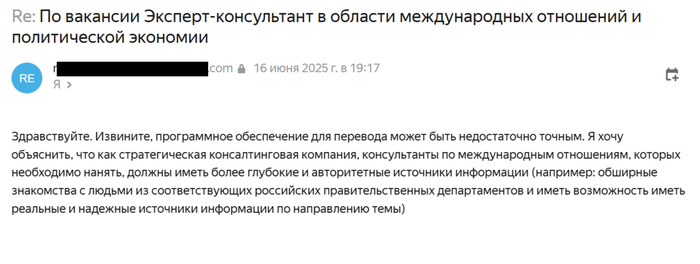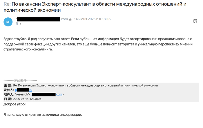 Второй работодатель общался по-русски, но с китайской почты и явно через переводчик. Моя квалификация его тоже удовлетворила, но под предлогом интересов работодателя он потребовал подтвердить «обширные знакомства с людьми из соответствующих российских правительственных департаментов и реальные и надежные источники информации по направлению темы».