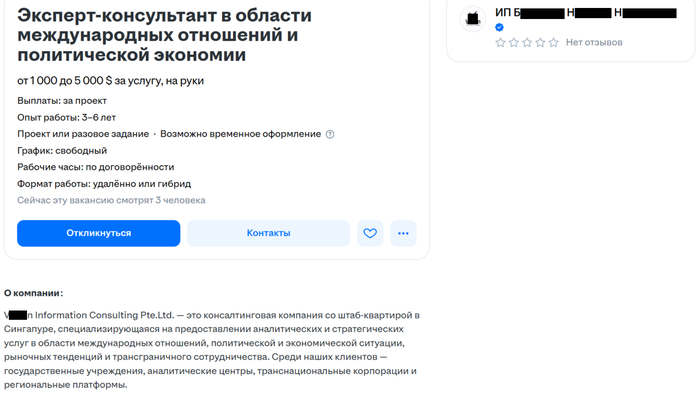 Найти контракт в России на услуги консалтинга по вопросу геополитических рисков сложно, но можно. Поэтому давно на hh.ru оставлял запрос на такой вид вакансий и внезапно появилось заманчивое предложение от ООО «К….» от 27000 до 455 000 ₽ за услугу, до вычета налогов, свободный график, удаленка.