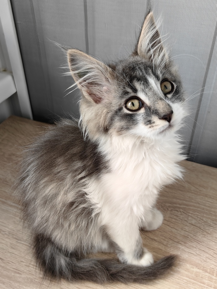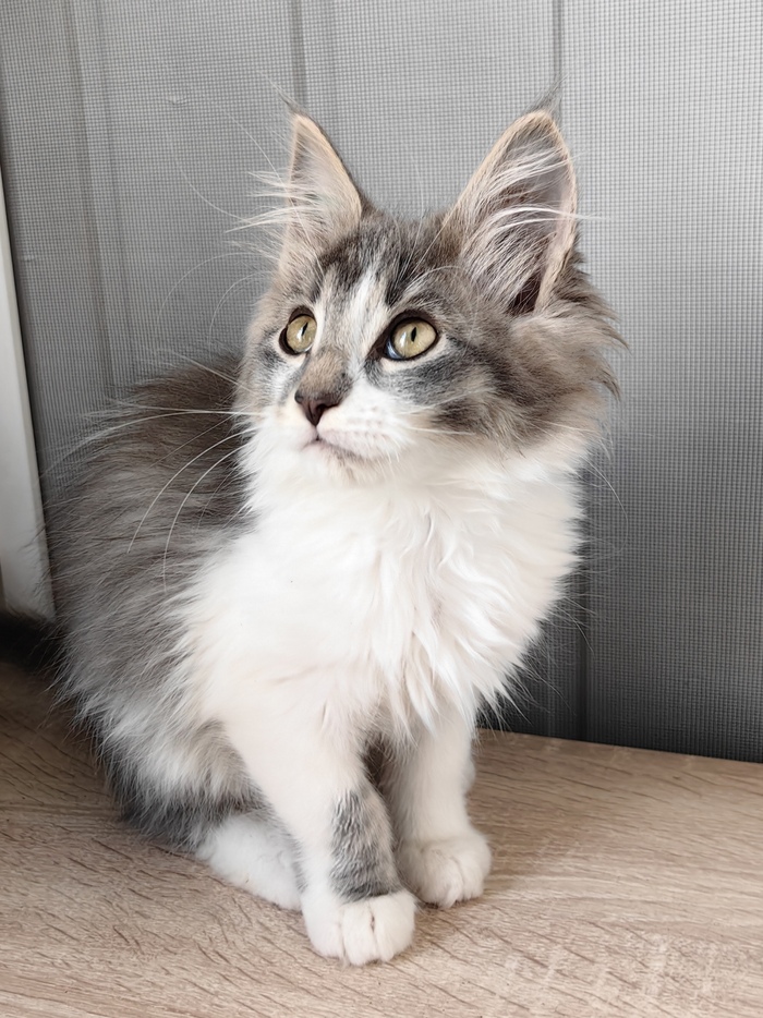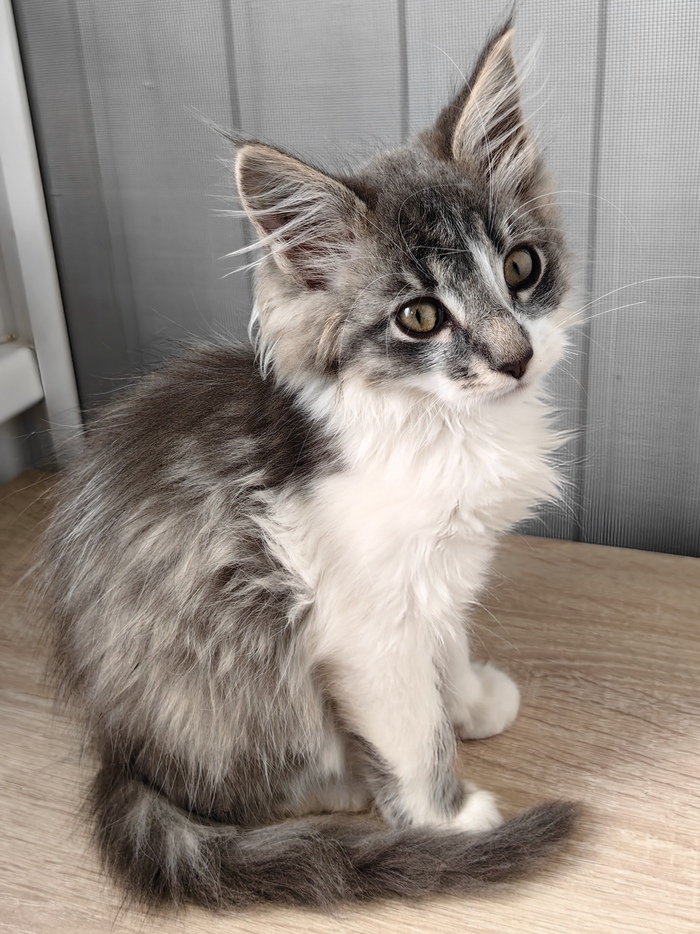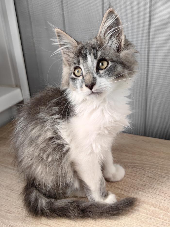 Мраморный серебристый окрас, белая грудка и животик, кисточки на ушках, и чудесный серый носик.