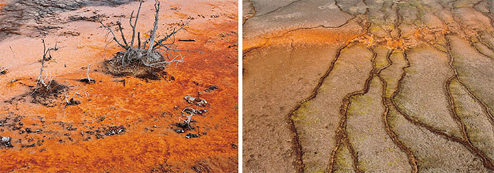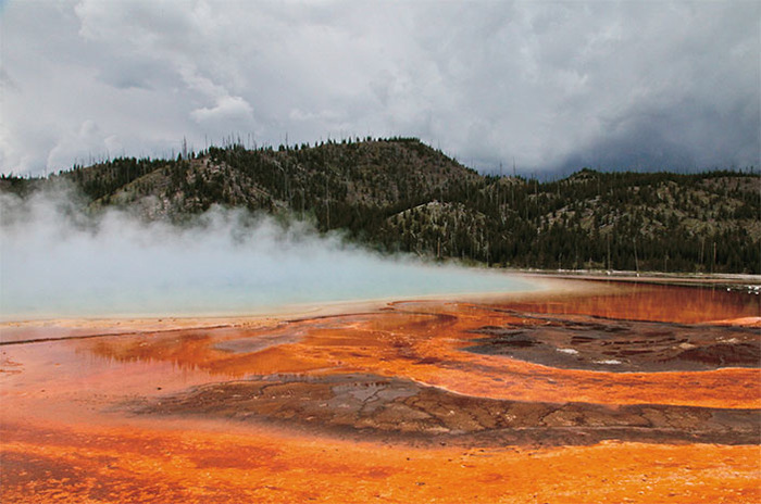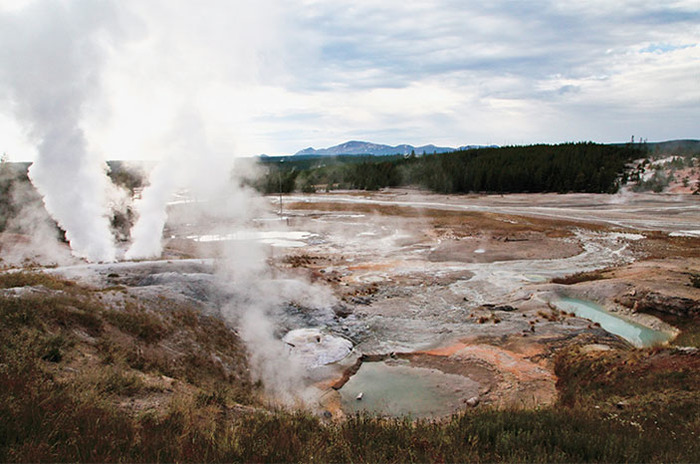 На берегу Йеллоустонского озера — большая термальная площадка. На ней кипят горячие озерца, сияют бирюзой бездонные колодцы, горячие источники выбрасывают кипяток в холодную воду. Местами среди грязевых дымящихся котлов и мутных луж еще можно увидеть чахлые умирающие сосенки.