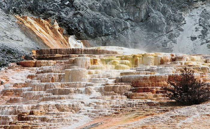 Очень красивы Мамонтовы горячие источники. Стекающая по склонам холмов горячая насыщенная солями вода образовала красивые отложения гейзерита и травентина, известковые блестящие террасы, белые и кое-где окрашенные в желтый и коричневый цвета. На солнце гора сверкает и переливается.