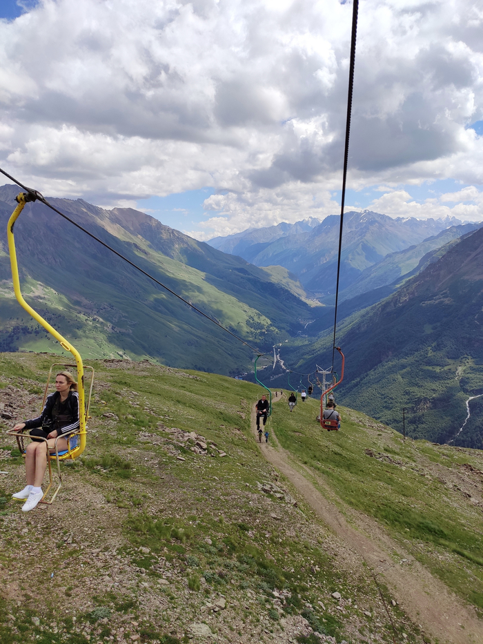 Прошлым летом думала, как и где отметить день рождения. Выбор пал на Пятигорск и Эльбрус — лететь недалеко, можно уложиться в 3 дня на всю поездку, места красивые. Я не имею отношения к зимним видам спорта, поэтому на Эльбрусе до этого была лишь раз. Путешествовала без машины, поэтому просто заранее забронировала экскурсию. Добрались со всей группой до подножья Эльбруса, далее свободное время — можно подняться на минимальную высоту, можно на более высокие уровни. Подъемник кресельный: