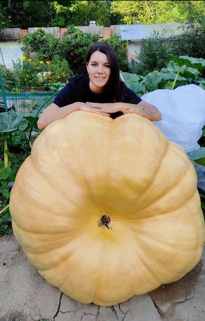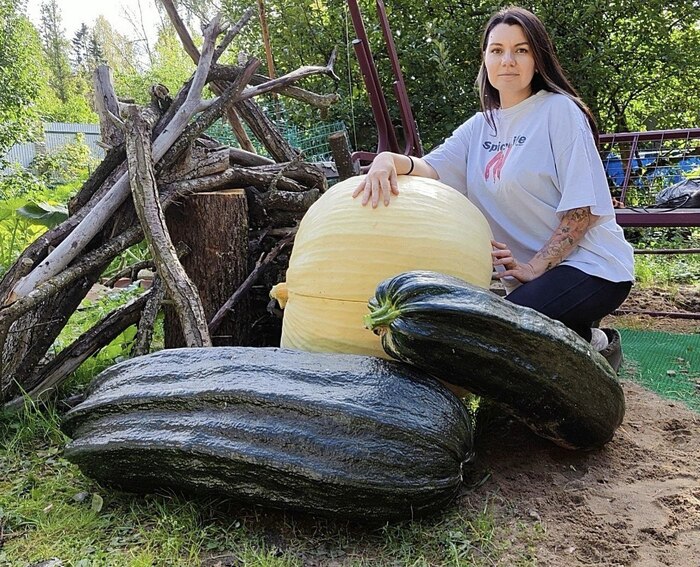 Алина выращивала впервые гигантский кабачок. В прошлом году она вырастила гигантскую тыкву весом 310 кг. Так же вырастив без теплиц и натурально