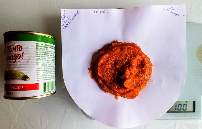 Осталось проверить содержание сухих веществ в икре. Сухие вещества – это то, что остается, когда из продукта удаляют воду. По ГОСТ в кабачковой икре сухих веществ должно быть не менее 19%. Измерение содержания сухих веществ я производил по ГОСТ 28561 (методом высушивания до постоянной массы) с небольшим отступлением. Дело в том, что если строго следовать требованиям ГОСТ, то нужно взять навеску образца 5 грамм, сушить в шкафу 2-4 часа, затем взвесить на весах второго класса точности, которые мне, как и большинству обычных потребителей не доступны. Для компенсации недостатка точности моих весов (±1 грамм) я увеличил навеску с 5 до 100 грамм, а время сушки с 2 до 40 часов. Температурный режим использовал как написано в ГОСТ - 105°С , который обеспечивает любая современная духовка. Сколько останется после сушки 100 граммов исходного продукта, таково и будет содержание сухих веществ в %.